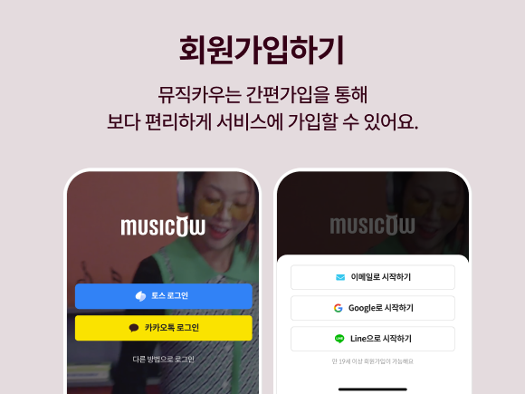 뮤직카우는 토스와 카카오톡을 통한 간편 로그인 연동으로 보다 편리하게 서비스 이용이 가능하며 그 외에도 이메일, 구글 계정 등을 통한 가입도 가능해요.