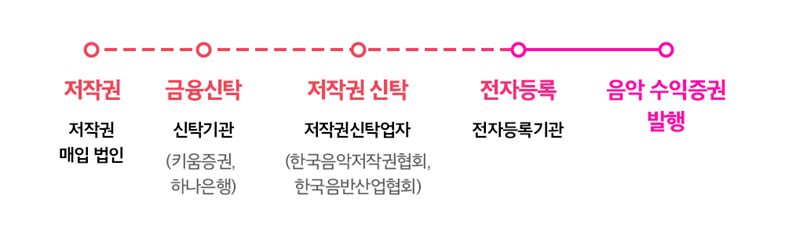 뮤직카우가 양수한 저작권은 신탁사 및 신탁업자에게 신탁하는 과정을 거쳐 사업자와 완전히 도산 절연되어 안전하게 분리 보관되며, 이후 전자등록기관의 전자등록 절차를 거쳐 증권의 형태로 발행됩니다.