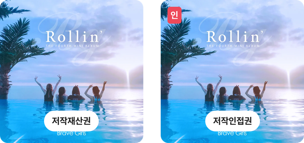 뮤직카우에서는 앨범 커버와 곡명의 배지 부착여부 및 저작권 정보 내 상세정보를 통해 두 권리를 구분하여 안내 드리고 있습니다. 배지가 있는 곡은 저작인접권이며, 없는 곡은 저작재산권으로 두 권리는 아래와 같은 차이가 존재합니다.