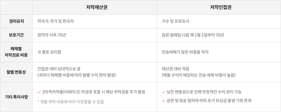 저작인접권의 음악 수익증권을 보유하는 경우, 저작권료를 정산 받는 기간이 원저작자 사후 70년간 보호되는 저작재산권에 비해 짧다는 점에 유의해야 합니다.