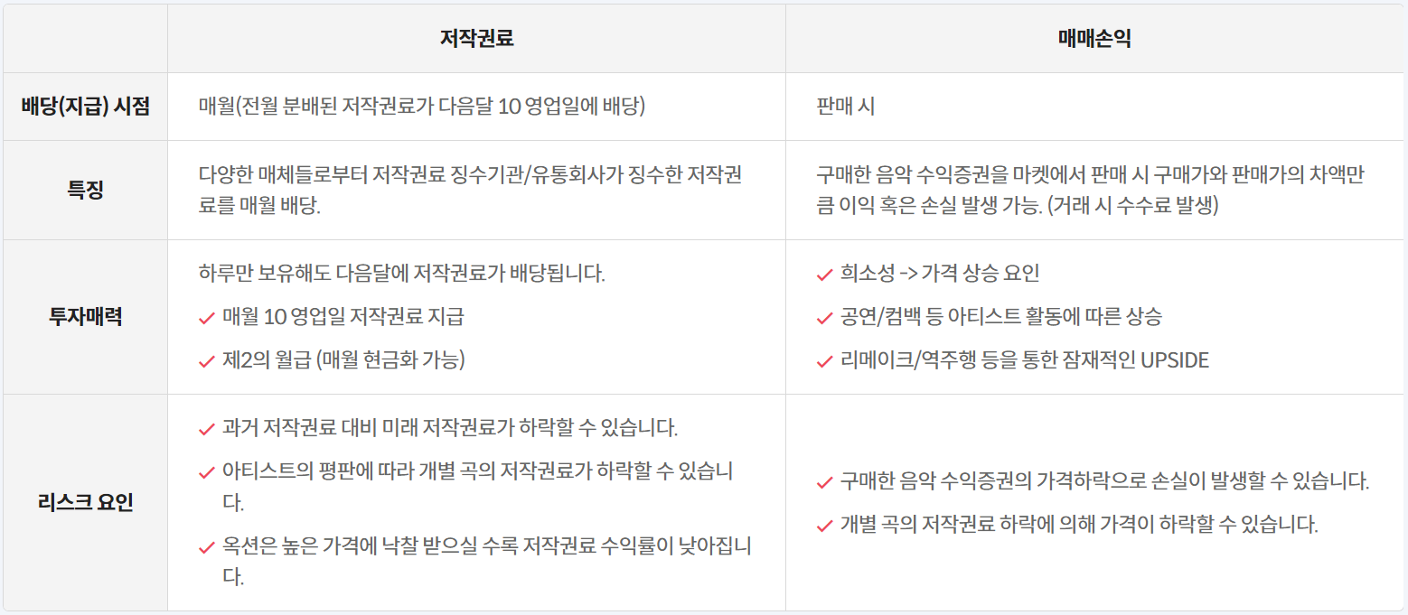 음악 수익증권을 통해 매월 저작권료 수익과 거래가격 변동에 따른 수익을 얻을 수 있습니다.